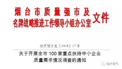 2018年4月27日,山東哈大電氣有限公司收到了來自“煙臺市質(zhì)量強(qiáng)市及**戰(zhàn)略推進(jìn)工作領(lǐng)導(dǎo)小組辦公室”發(fā)來的紅頭文件,哈大電氣正式入選煙臺市“質(zhì)量強(qiáng)市”100家重點扶持企業(yè)。全開發(fā)區(qū)只有10家企業(yè)入選,哈大電氣為其中之一。
