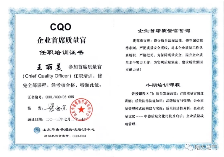 近幾年,哈大電氣一直將“質(zhì)量”放在公司的戰(zhàn)略高度上,上圖為公司品管部部長經(jīng)過培訓(xùn)后獲得了“企業(yè)**質(zhì)量官”的資質(zhì)證書。